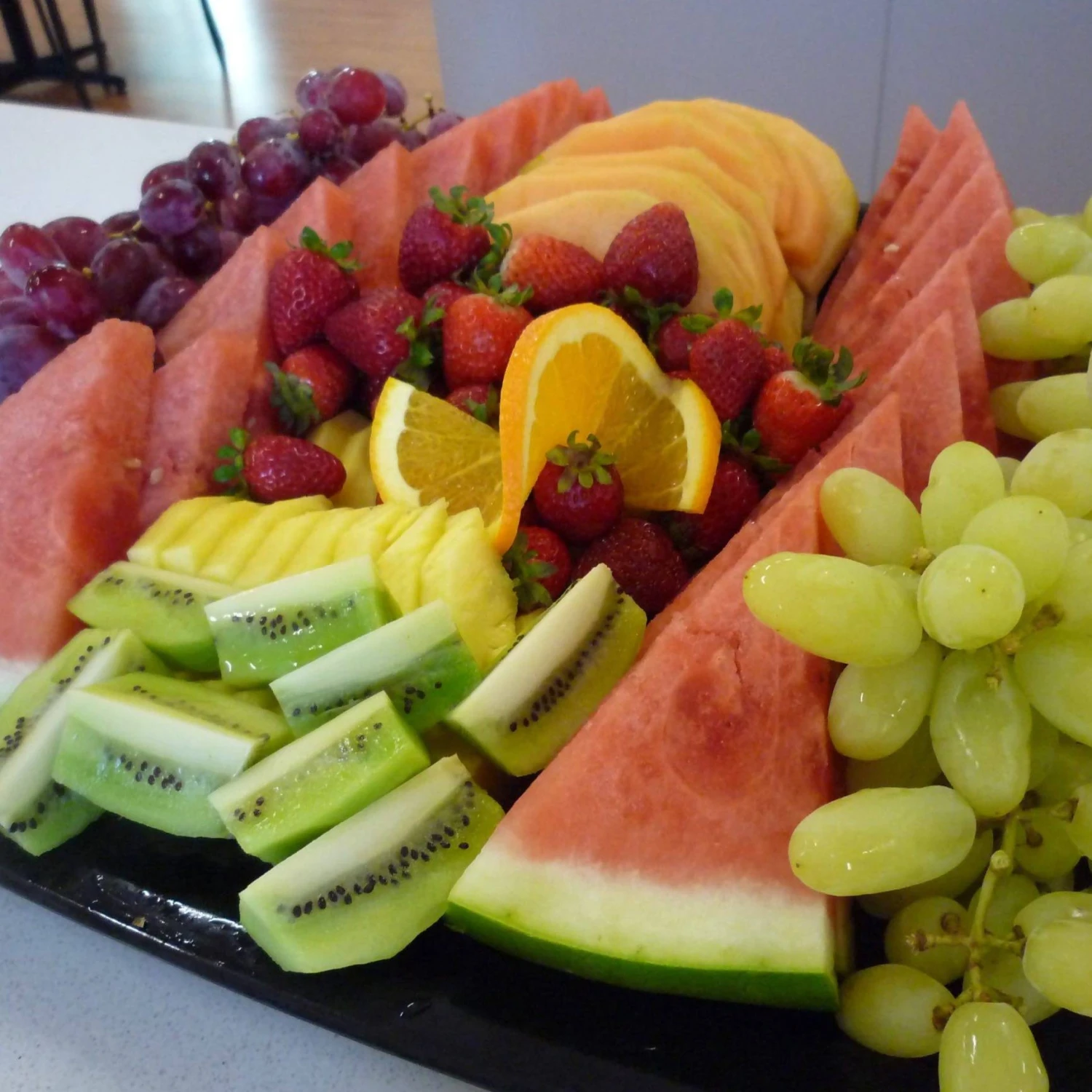 Check out our Fruit Platters, excellent for corporate functions, picnics or even parties! This platter includes Grapes, Watermelon, Kiwifruit, Strawberries, Rockmelon & Pineapple.