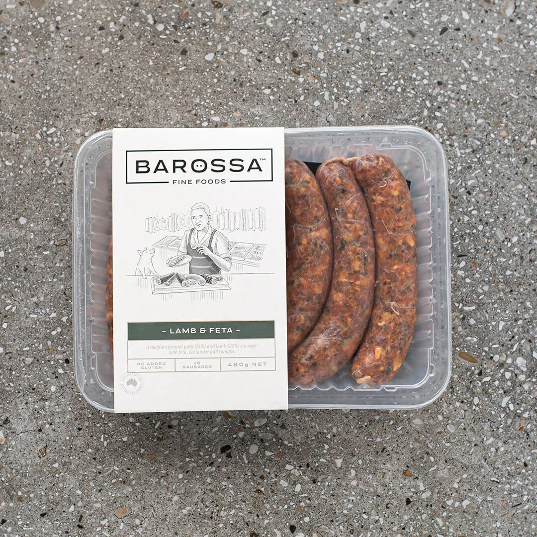 Lamb & Feta Sausages. A medium ground Lamb sausage with feta, coriander and tomato. Gluten Free with six sausages per pack.