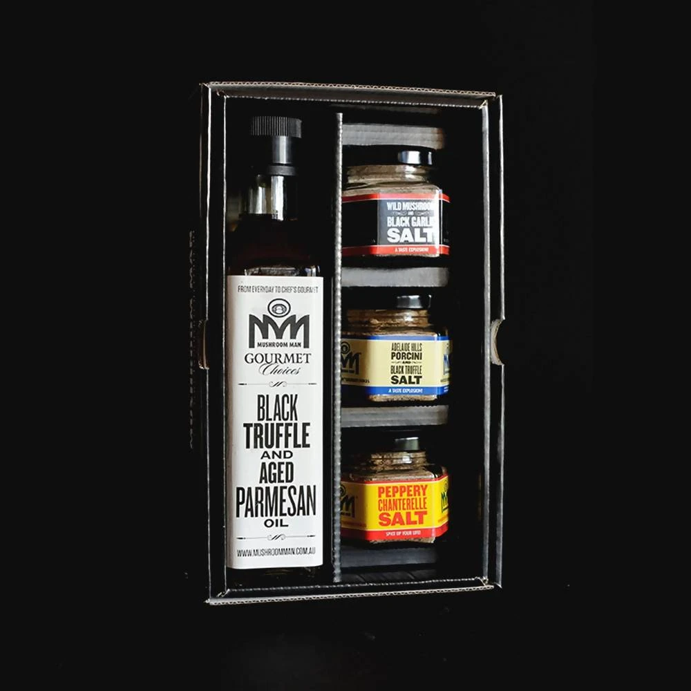 Black Truffle and Aged Parmesan Oil. Wild Mushroom and Black Garlic Salt. Adelaide Hills Porcini and Black Truffle Salt. Peppery Chanterelle Salt.